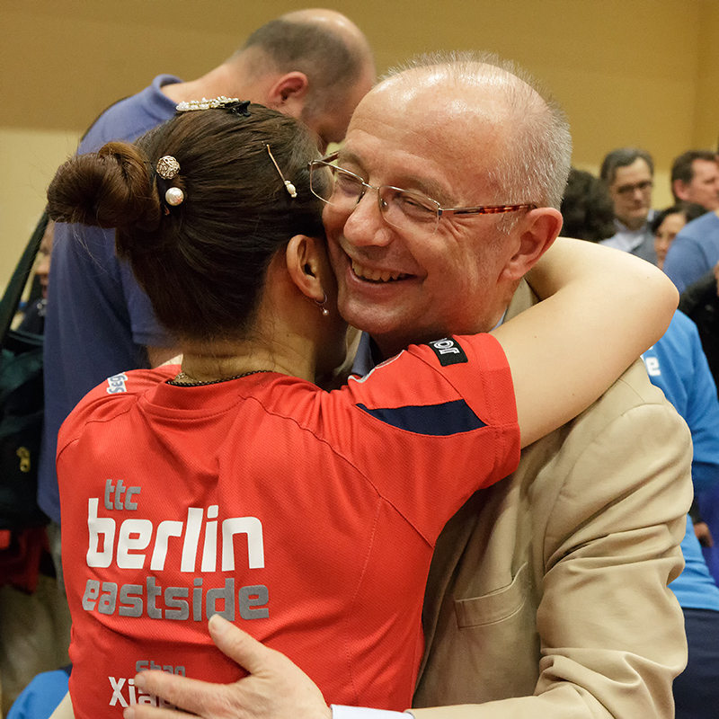 Beschreibung | ...umarmt die glückliche Siegerin, die den verdienten 3:1 Sieg der Mannschaft herstellen konnte und mit 2 Siegen zur Heldin des Abends wurde |