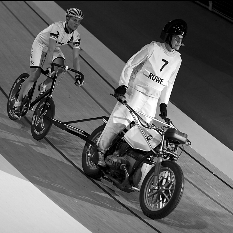 Beschreibung | ...wurde auch beim Sechstagerennen gefahren. Hier F. Fernow hinter Schrittmacher Bäuerlein |