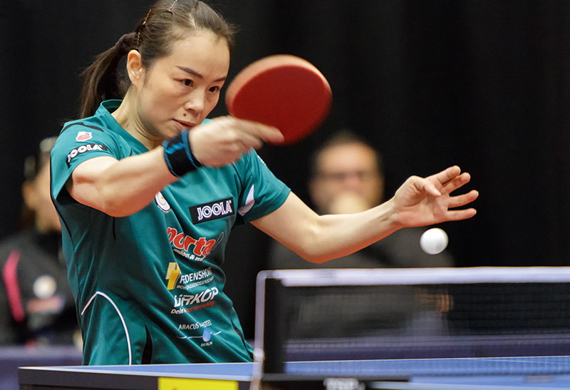 Beschreibung | Die Chinesin aus Hongkong spielte erstmals für die Berlinerinnen und mußt gleich gegen die Spitzenspielerin Yaping Ding aus Bingen antreten. Die Abwehrkünstlerin aus Bingen zeigte eine trotz ihrer 50 Jahre eine grandiose Leistung und siegte mit 3:0 |