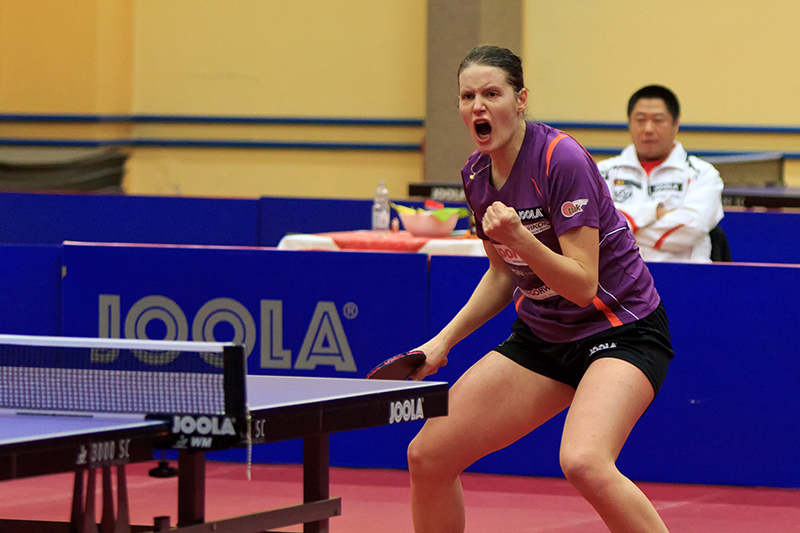 Beschreibung | ...steuerte zwei Siege mit einer herausragenden Leistung zum Erfolg gegen die Österreicherinnen bei. Hier bei einem wichtigen Punktgewinn im entscheidenden Satz gegen Li Fen. |